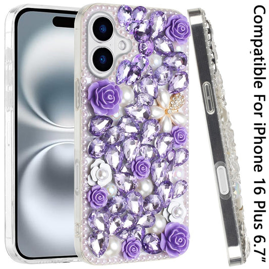 For Apple iPhone 16 Plus (6.7") Fashion Rose Flower Floral Bling Crystal 3D Full Diamonds Pearl Sparkle Rhinestone Glitter Hybrid Case Cover