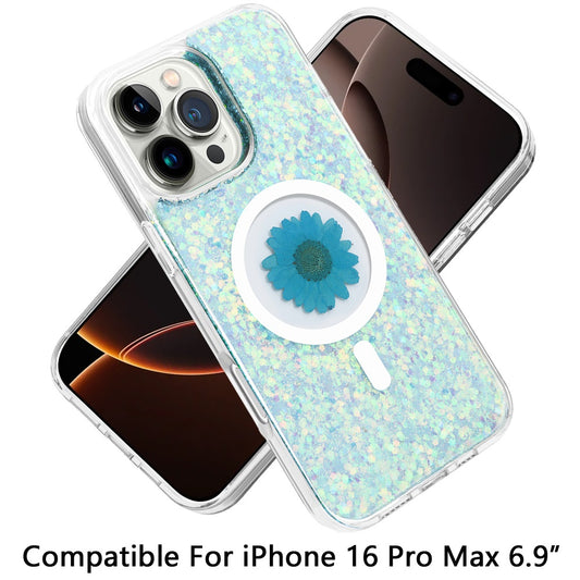 For Apple iPhone 16 Pro Max (6.9") Magnetic Circle MagSafe Wireless Compatible Epoxy Glitter Flower Shiny Sparkle Bling Hybrid Slim TPU Case Cover