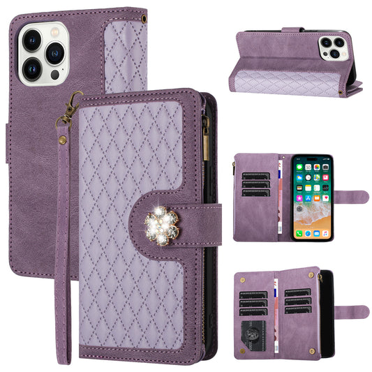 For Apple iPhone 16e (E edition) PU Leather Wallet Design Jewel Bling with Credit Card Holder Flip Folio Pouch Zipper Purse Wrist Strap Case Cover