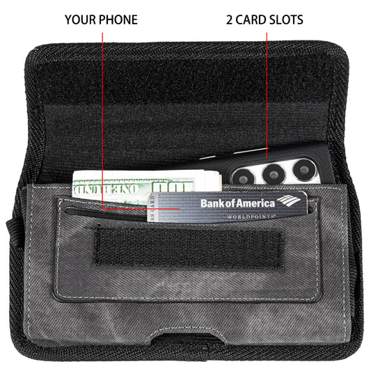 For Motorola Moto G Power 2022 Universal Horizontal Cell Phone Case Fabric Holster Carrying Pouch with Belt Clip and 2 Card Slots fit XL Devices 7" [Black Denim]