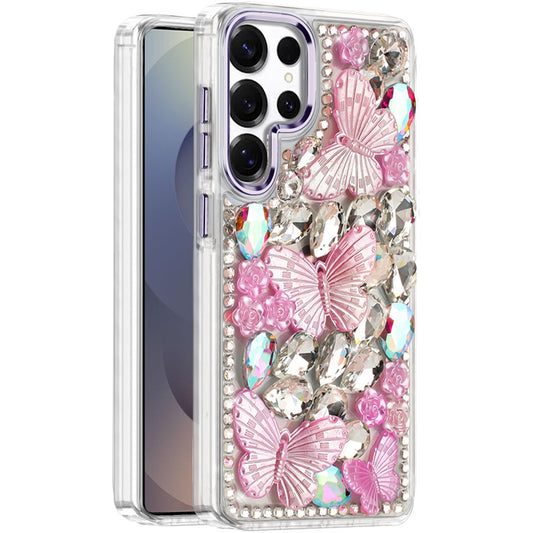 For Samsung Galaxy S25 Ultra 3D Diamond Floral Butterfly Bling Stone Hybrid, Sparkly Rhinestone Gemstone Back Shockproof Case Cover