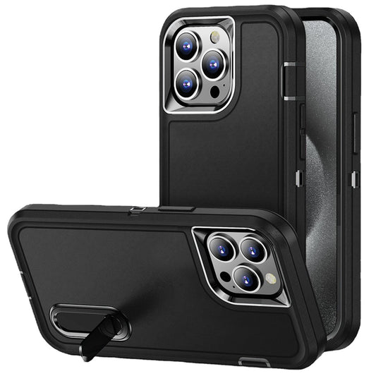 For Apple iPhone 15 Hybrid 3 Layers Hard 3in1 Shockproof with Kickstand Heavy Duty Hard TPU Rubber Anti-Drop Case Cover Black
