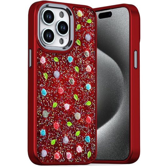 For Apple iPhone 15 Floral Design Embedded Glass Diamond Fancy Fashion Glitter Bling Sparkly Hybrid Rugged TPU Bumper Case Cover Red