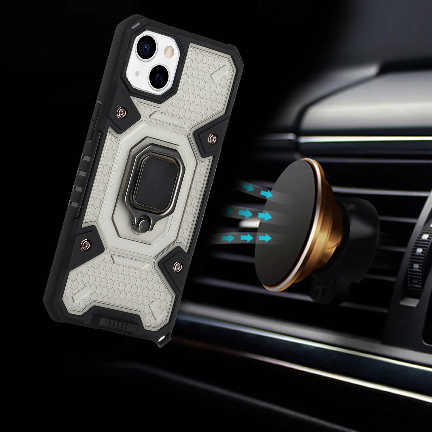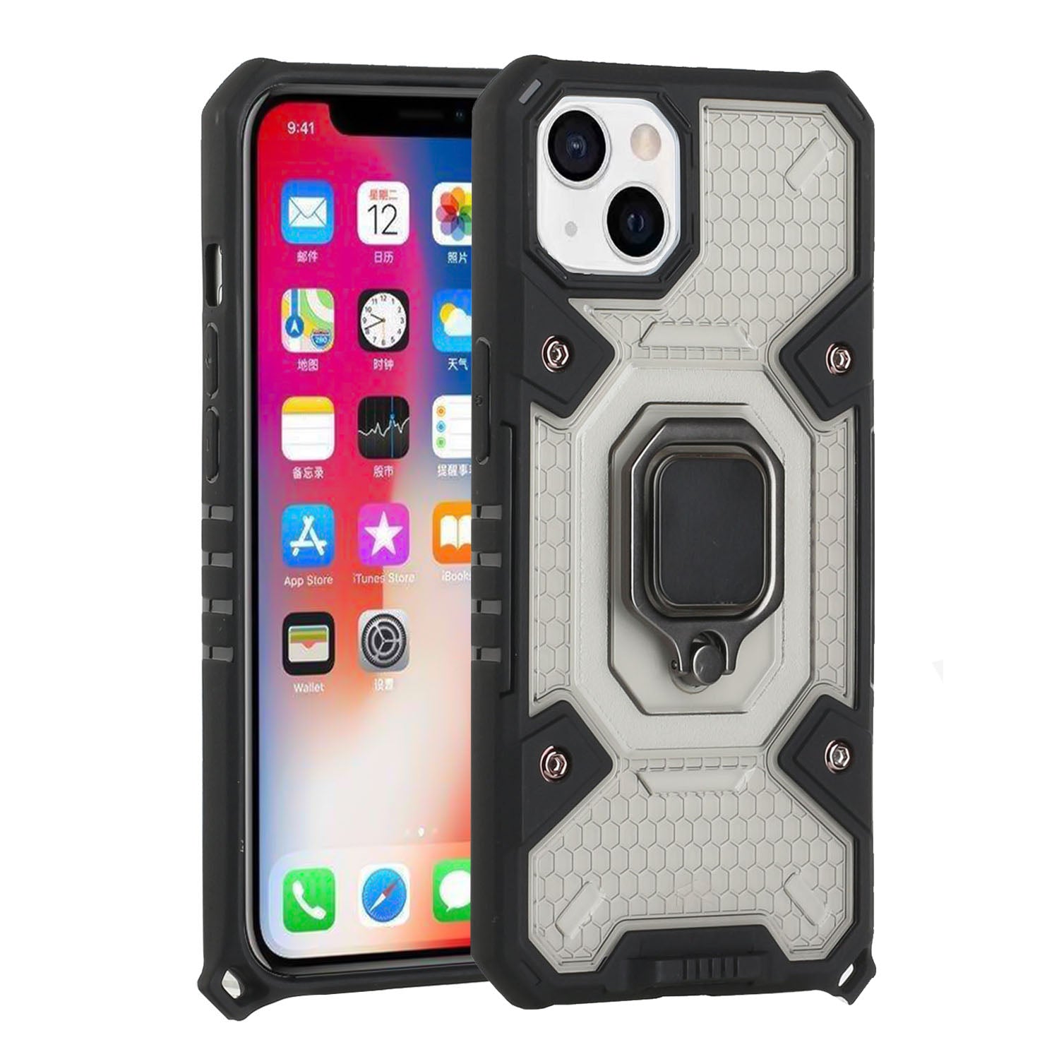 Transparent Armor Defender Design Hybrid Protective Phone Case with [Ring Holder Kickstand] [Magnetic Car Mount Feature] Soft TPU Shock -Absorbing Bumper & Hard PC Frame