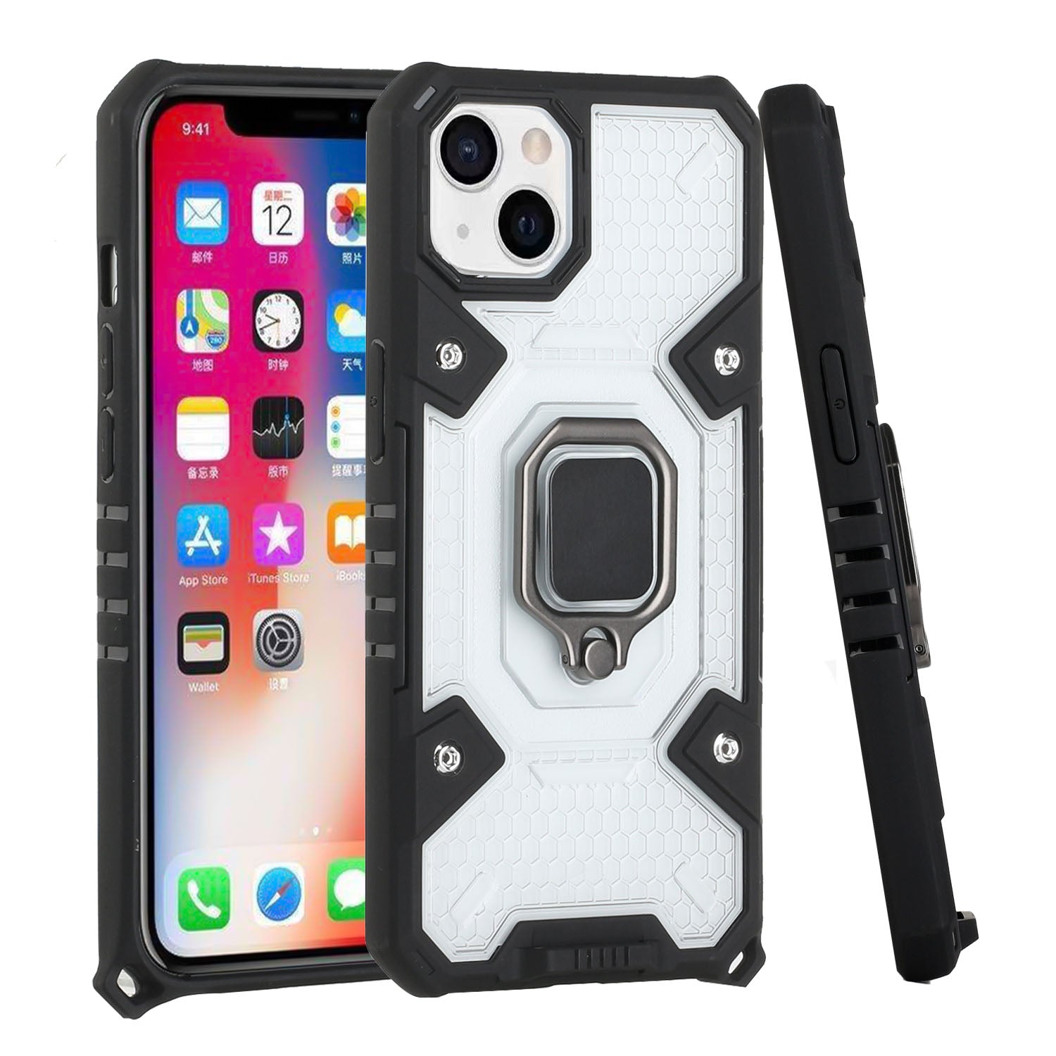 Apple iPhone 13 Pro (6.1") Clear Silicone Shockproof Tuff Hybrid Protection Cover Transparent TPU with Magnetic Ring Kickstand