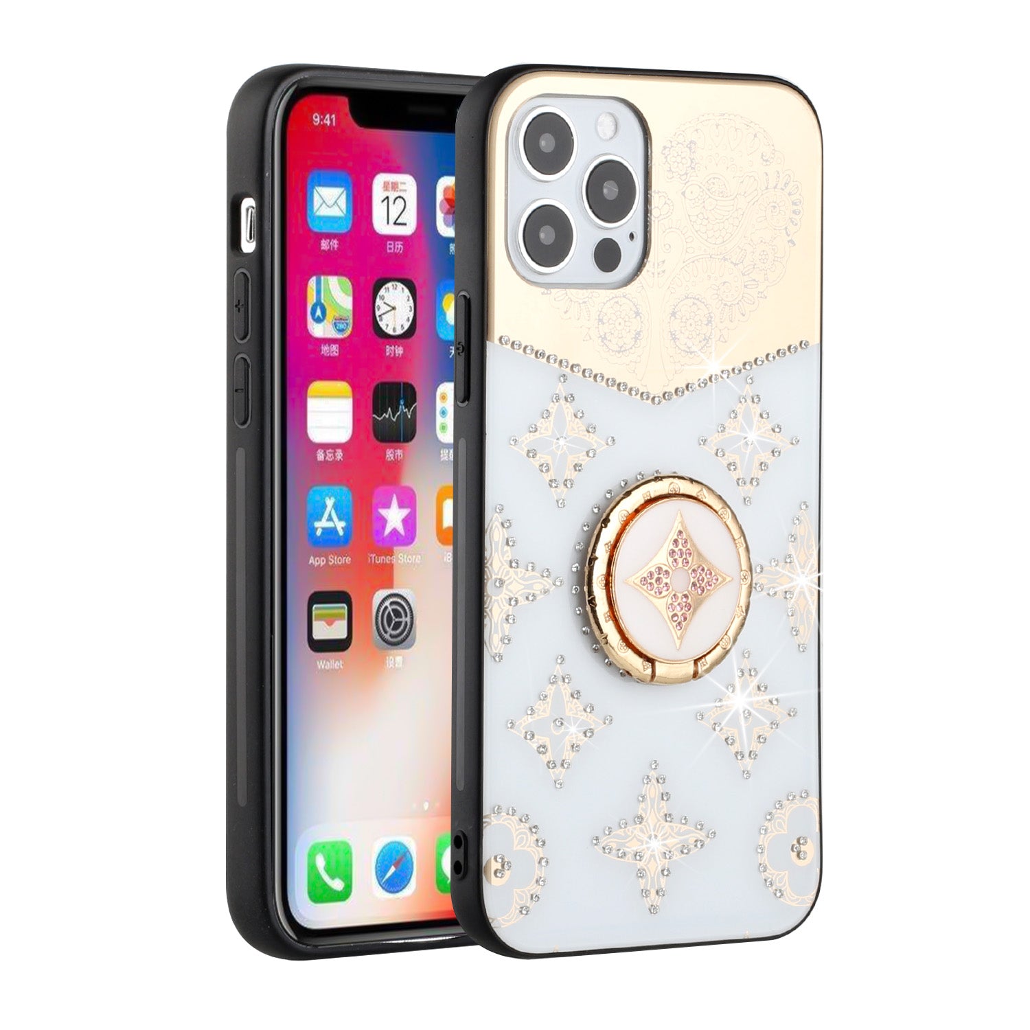Slim Luxury Bling Rhinestone Glitter Crystal Diamonds Love Floral Design TPU Case With Ring Stand Hybrid Shockproof Phone Case