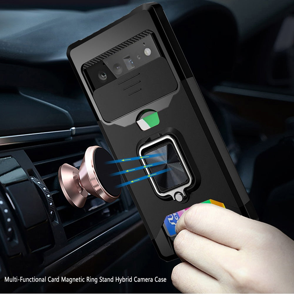 Ring Stand Case with Slide Camera Cover Kickstand and Credit Card Holder Slot, Military Grade Protective Hybrid Armor Cover with Rotate Magnetic Stand