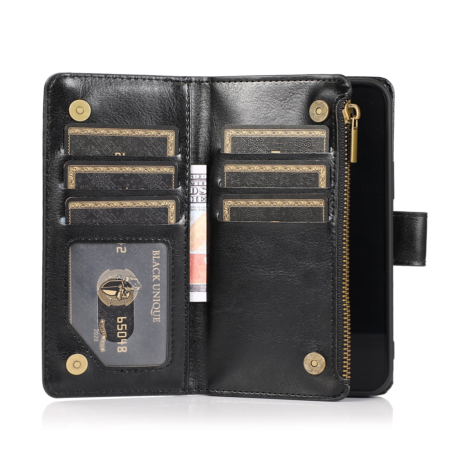 • Card slots holder combine 9 card slots and 1 transparent window for easy access to your ID card or photo.