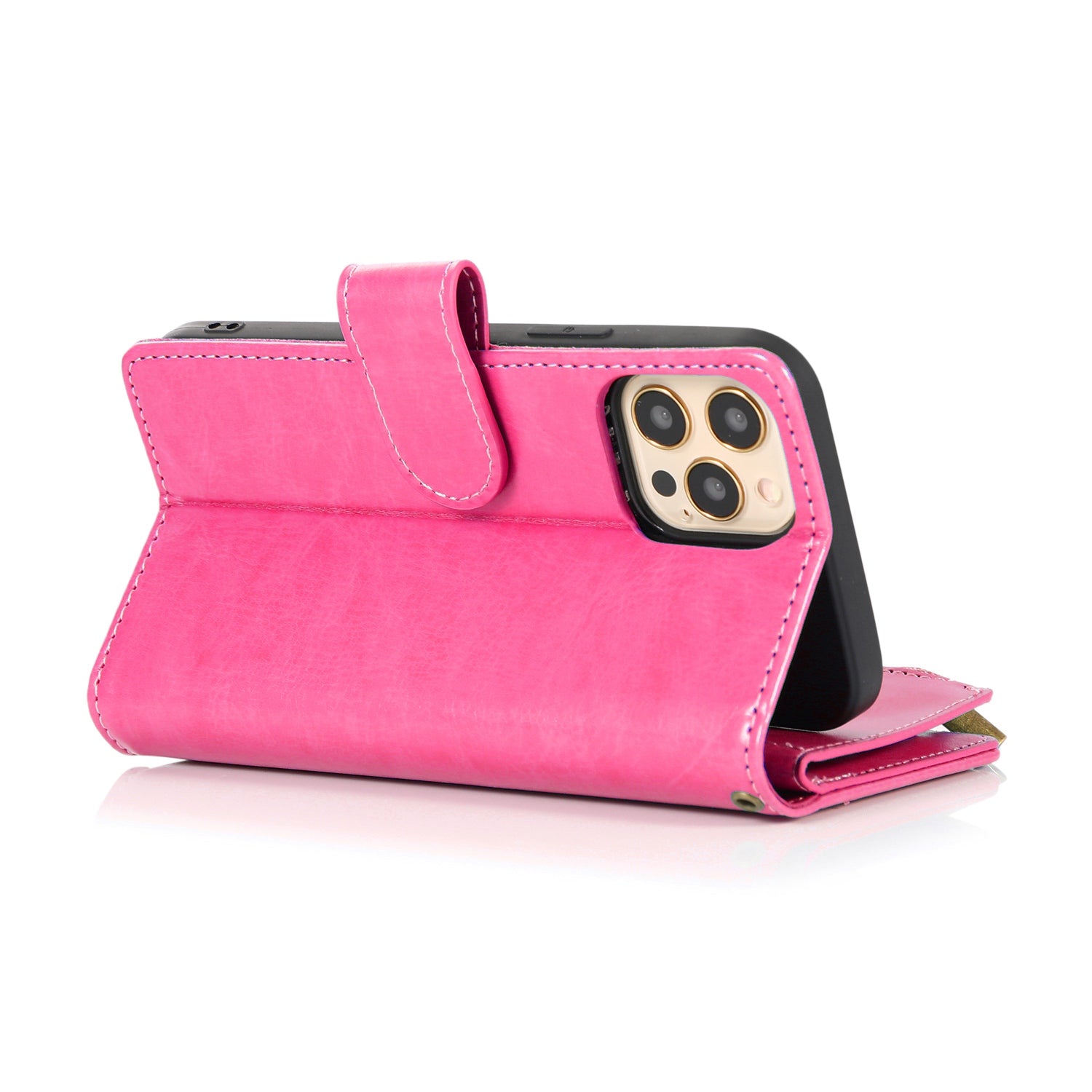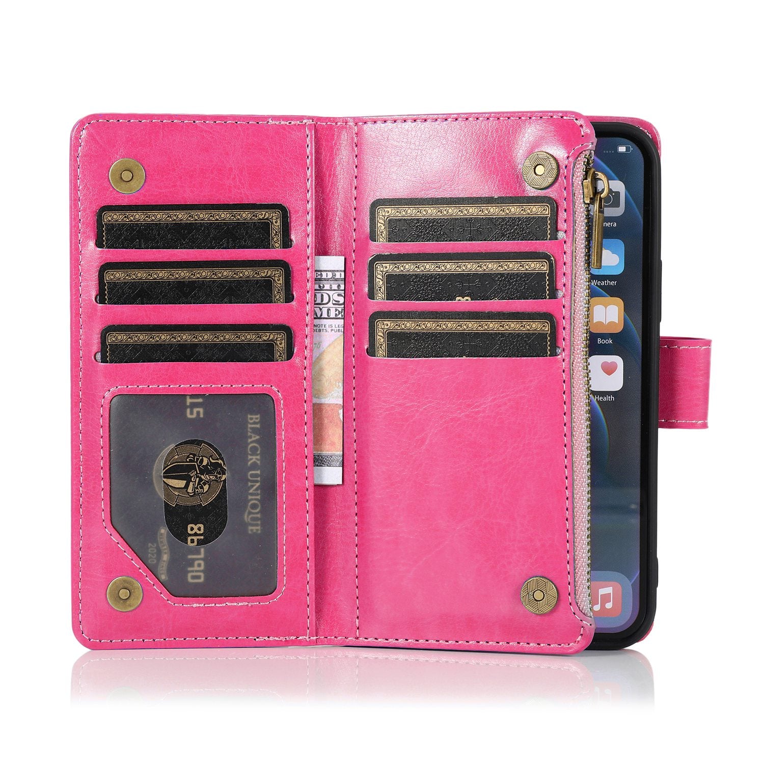 For Apple iPhone 16 (6.1") Leather Zipper Wallet Case 9 Credit Card Slots Cash Money Pocket Clutch Pouch Stand & Strap Case Cover Hot Pink