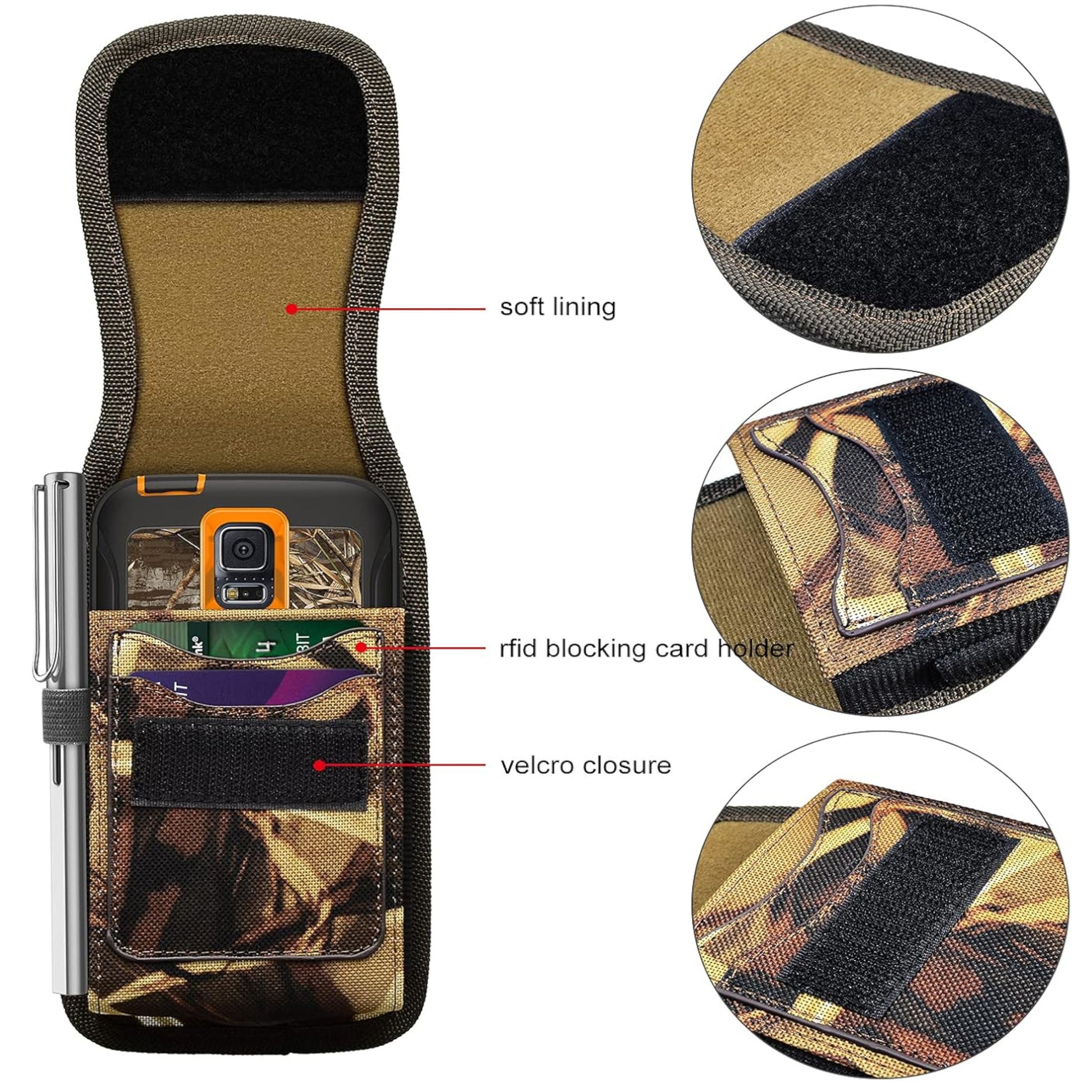 Premium Universal Vertical Nylon Hunting Camo Pouch Rugged with ID Credit Card Storage & Belt Clip Holster, Carrying Cell Phone Pouch Velcro Closure Case Cover.