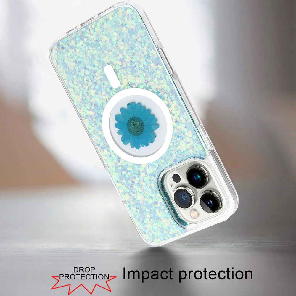Magnetic Case Real Flower Glitter Bling Sparkle Shiny Compatible with MagSafe Crystal Shockproof Hard Back Soft Slim Protective Cover