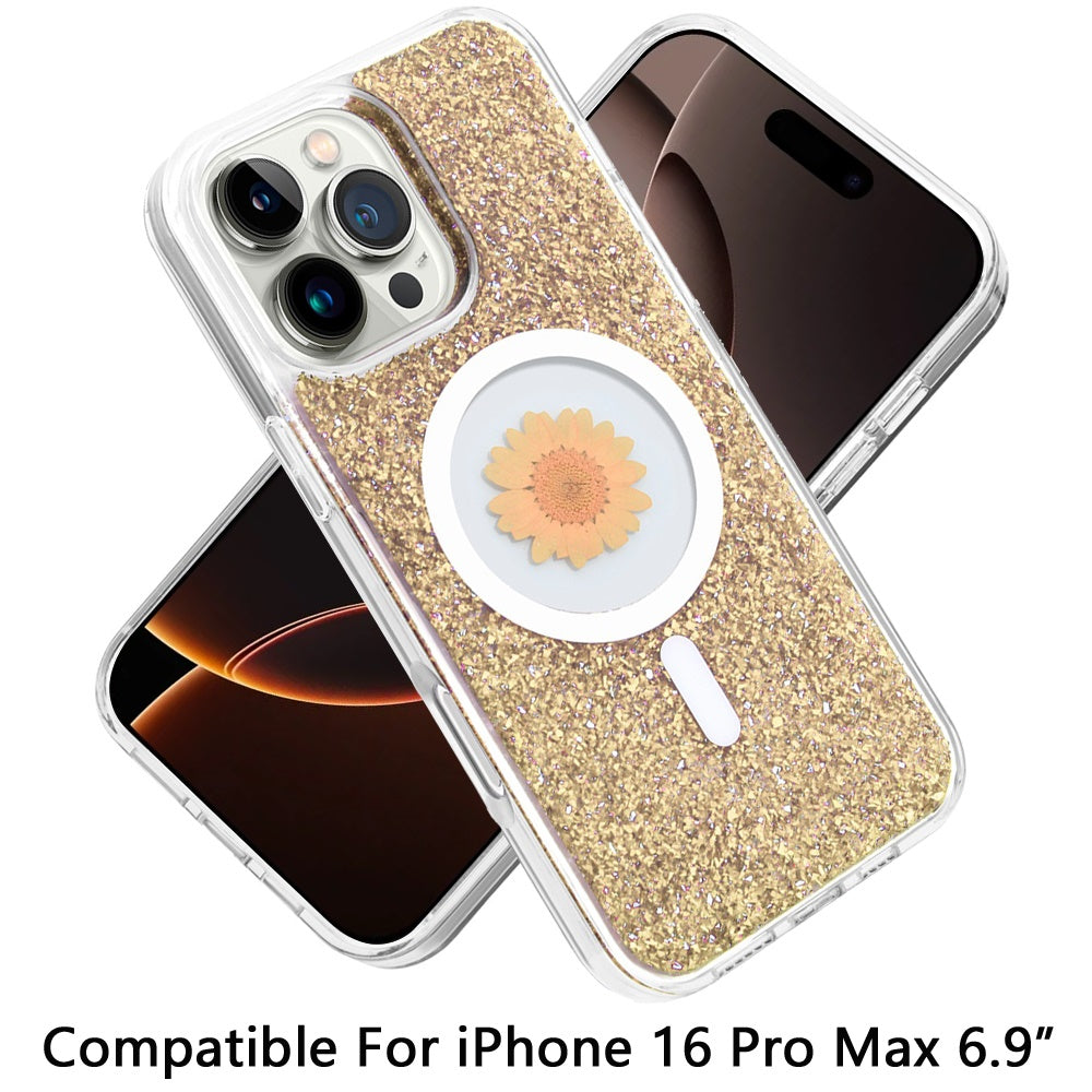 For Apple iPhone 16 Pro Max (6.9") Magnetic Circle MagSafe Wireless Compatible Epoxy Glitter Flower Shiny Sparkle Bling Hybrid Slim TPU Case Cover