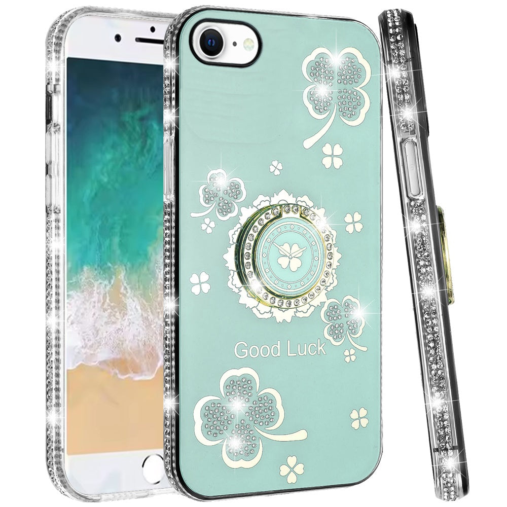 For Apple iPhone 16e Diamonds Bling All Around Edges Sparkly Glitter Hybrid with Ring Stand Holder Fashion Good Luck Case Cover