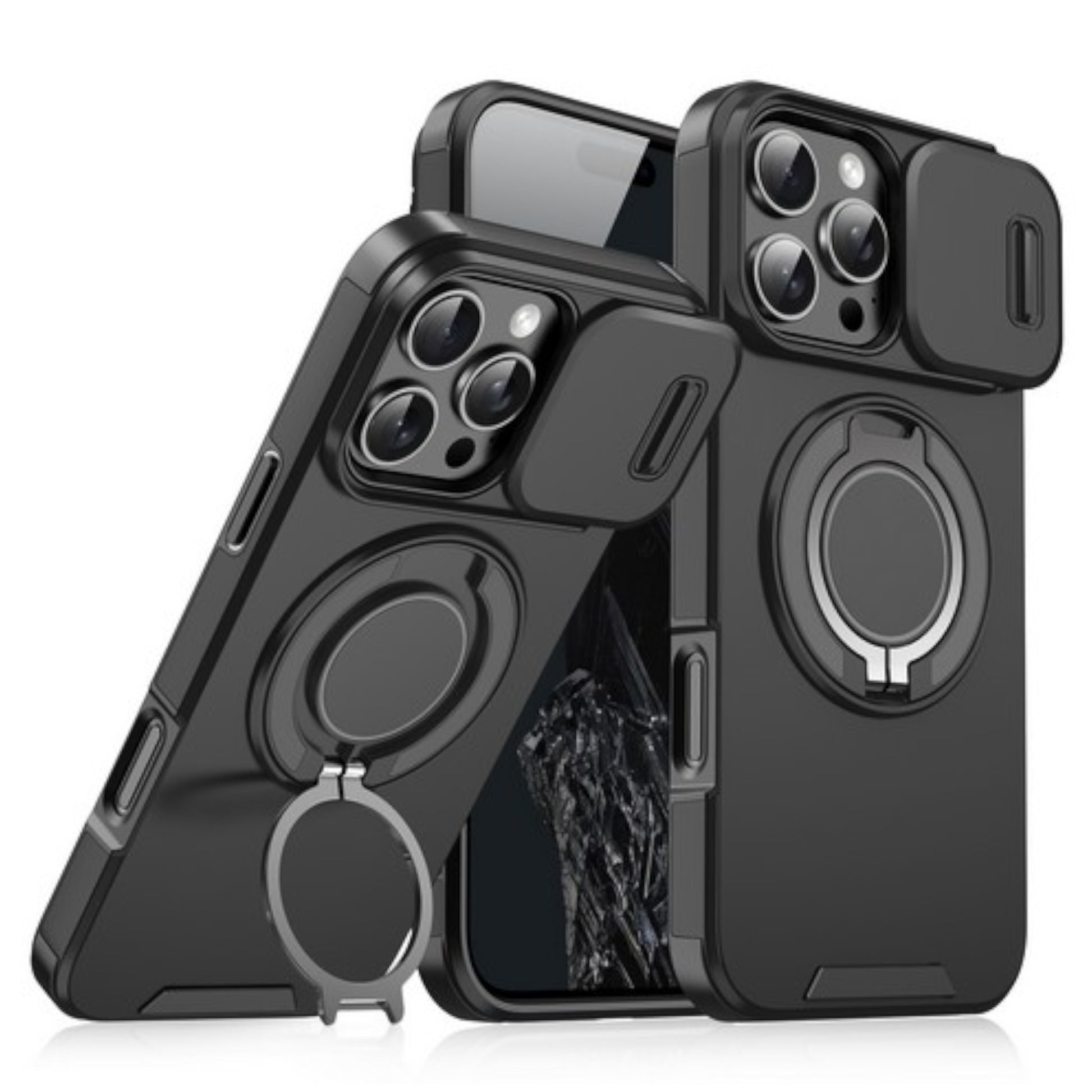 For Apple iPhone 16 E (6.1") Protect your phone with this premium hybrid case featuring a 360° rotatable magnetic ring stand and a built-in camera slide protector. Designed for MagSafe compatibility, this case allows effortless wireless charging and accessory use. Its durable PC and TPU hybrid construction offers excellent shock resistance while maintaining a slim, lightweight profile. The precise cutouts provide seamless access to all phone functionalities, making it a perfect choice for style and protection.