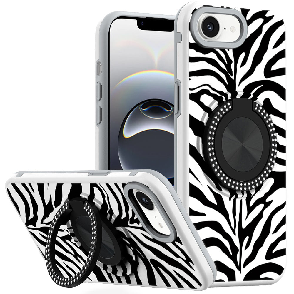 For Apple iPhone 16e Pattern Design Hybrid with Invisible Ring Stand & Magnetic Back, Shockproof Protective Grip Case Cover Zebra