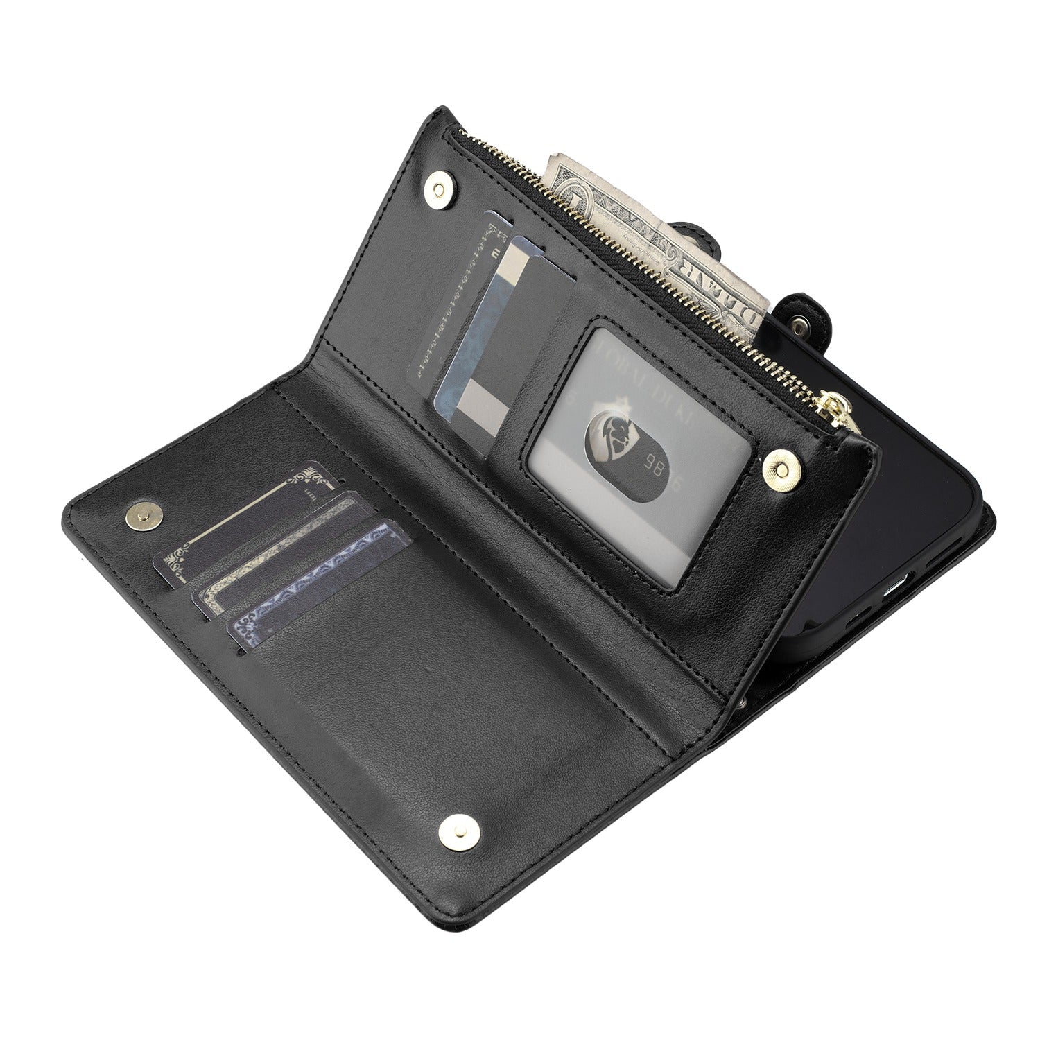 For Apple iPhone SE 4 Wallet Purse Stylish Design with Credit Card & ID Slots, Durable Zipper Storage, Adjustable Lanyard Case Cover Black