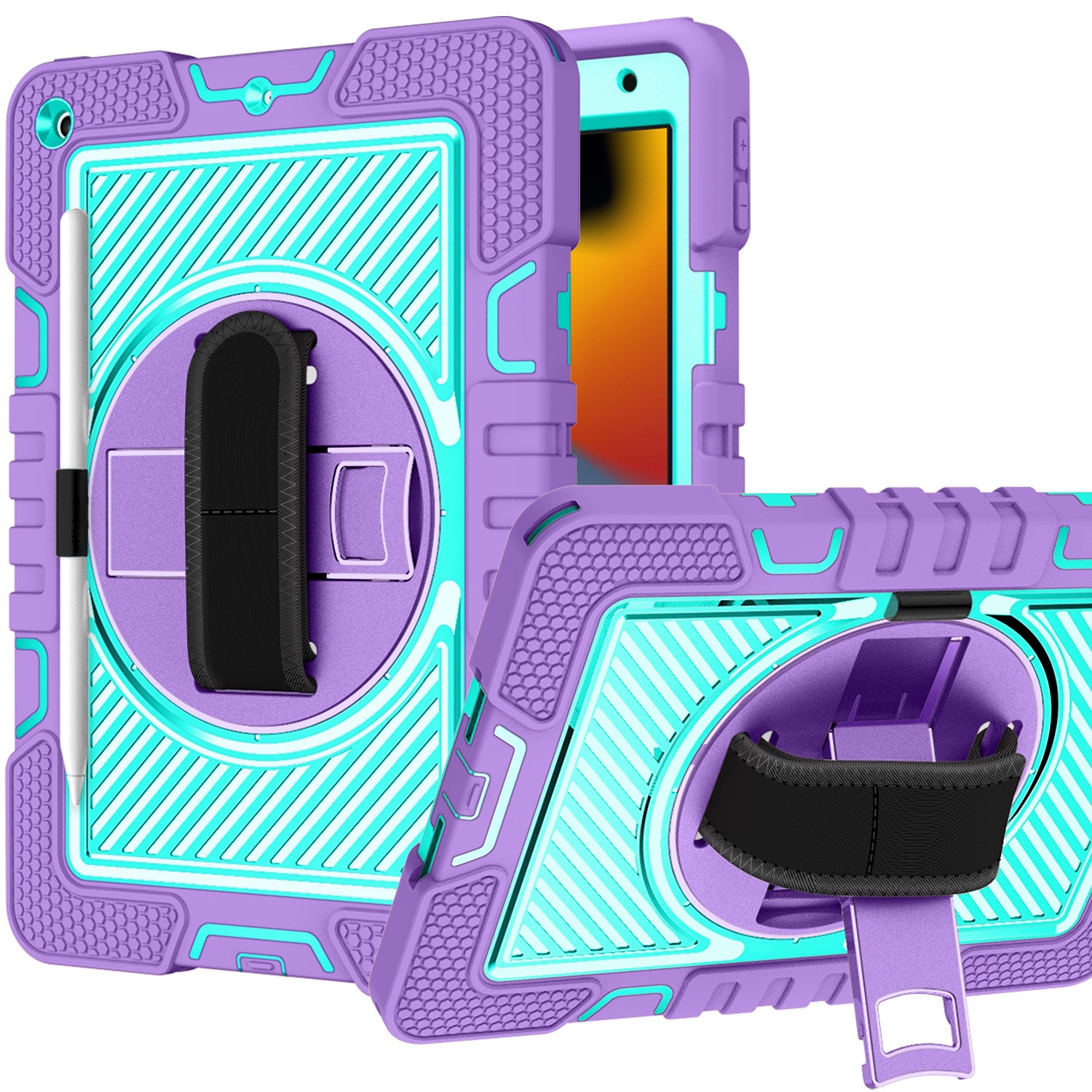 Purple Teal Protect your Tablet with this 3-in-1 shockproof tablet case, featuring a kickstand, hand strap, and detachable shoulder strap for maximum convenience. Designed for durability, this case offers shockproof protection against drops and everyday wear. The adjustable hand strap ensures a secure grip, while the shoulder strap provides a hands-free carrying option-ideal for work, school, or travel. Plus, the built-in Apple Pencil holder keeps your stylus within reach. With a rugged yet lightweight design, this case delivers all-around protection and functionality for your iPad Air.
