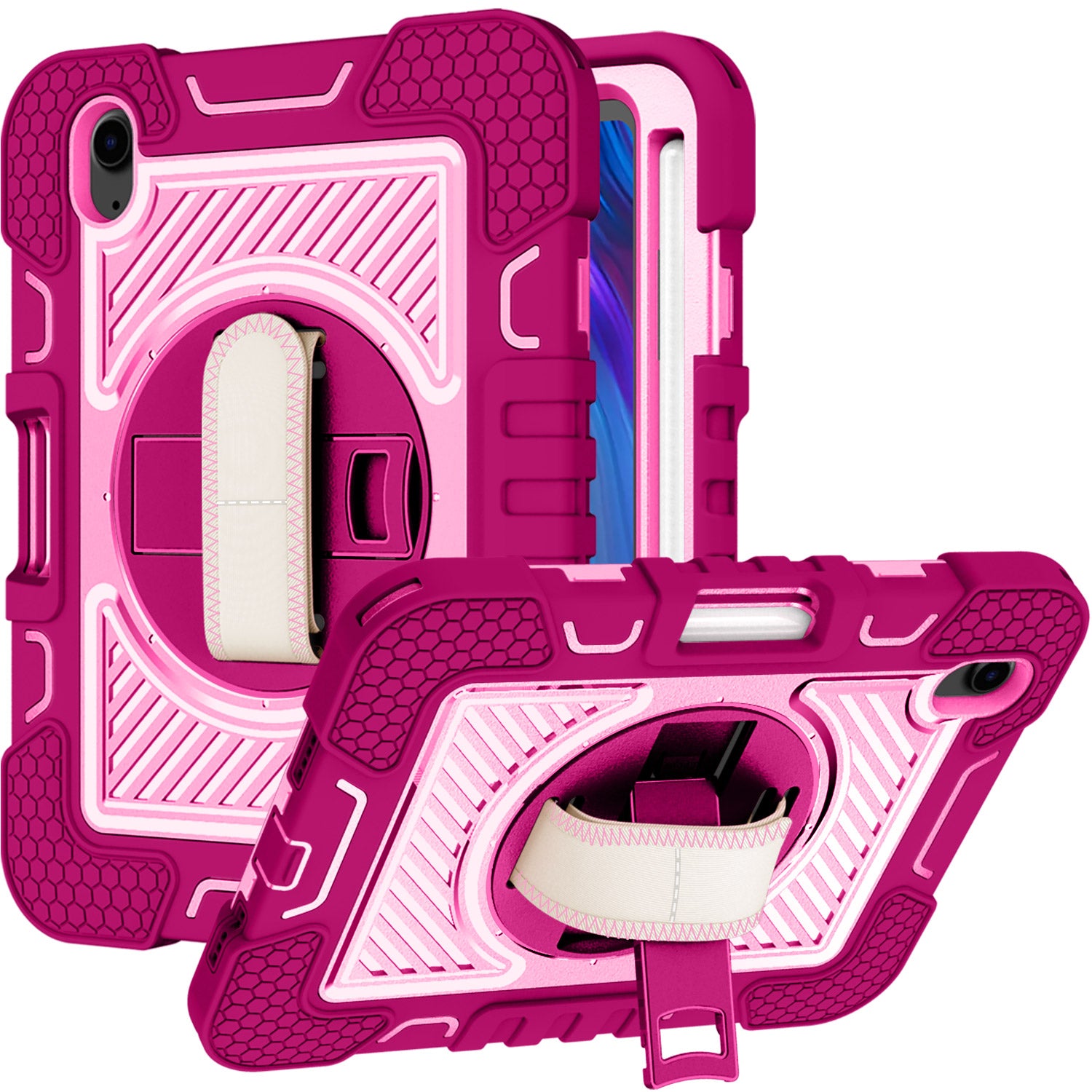 Rose Pink Protect your Tablet with this 3-in-1 shockproof tablet case, featuring a kickstand, hand strap, and detachable shoulder strap for maximum convenience. Designed for durability, this case offers shockproof protection against drops and everyday wear. The adjustable hand strap ensures a secure grip, while the shoulder strap provides a hands-free carrying option-ideal for work, school, or travel. Plus, the built-in Apple Pencil holder keeps your stylus within reach. With a rugged yet lightweight design, this case delivers all-around protection and functionality for your iPad Air.