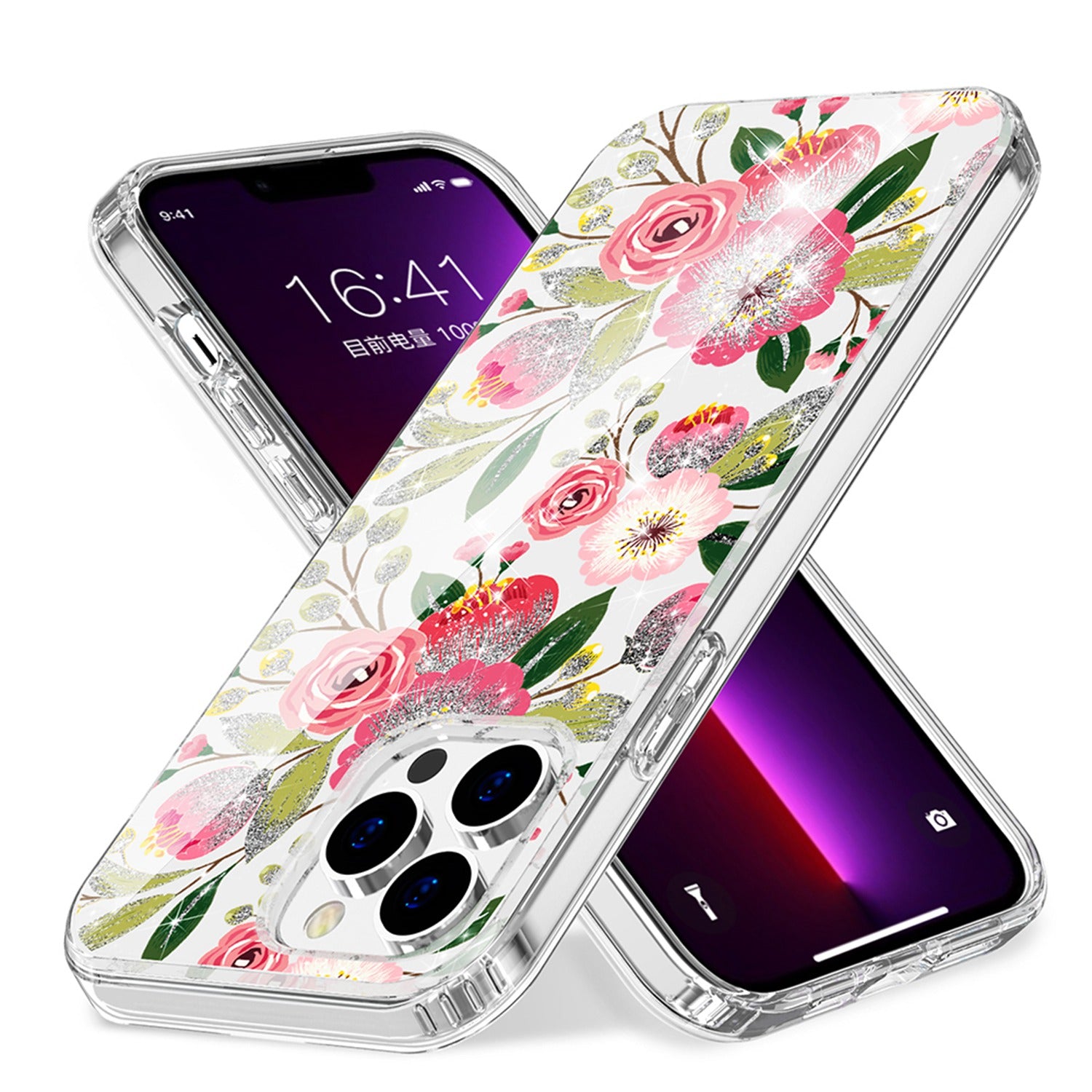 For iPhone 14 Pro (6.1") Beautiful Laser Clear Bling Glitter Design Pattern Hybrid Gummy Hard PC and TPU Phone Case Cover