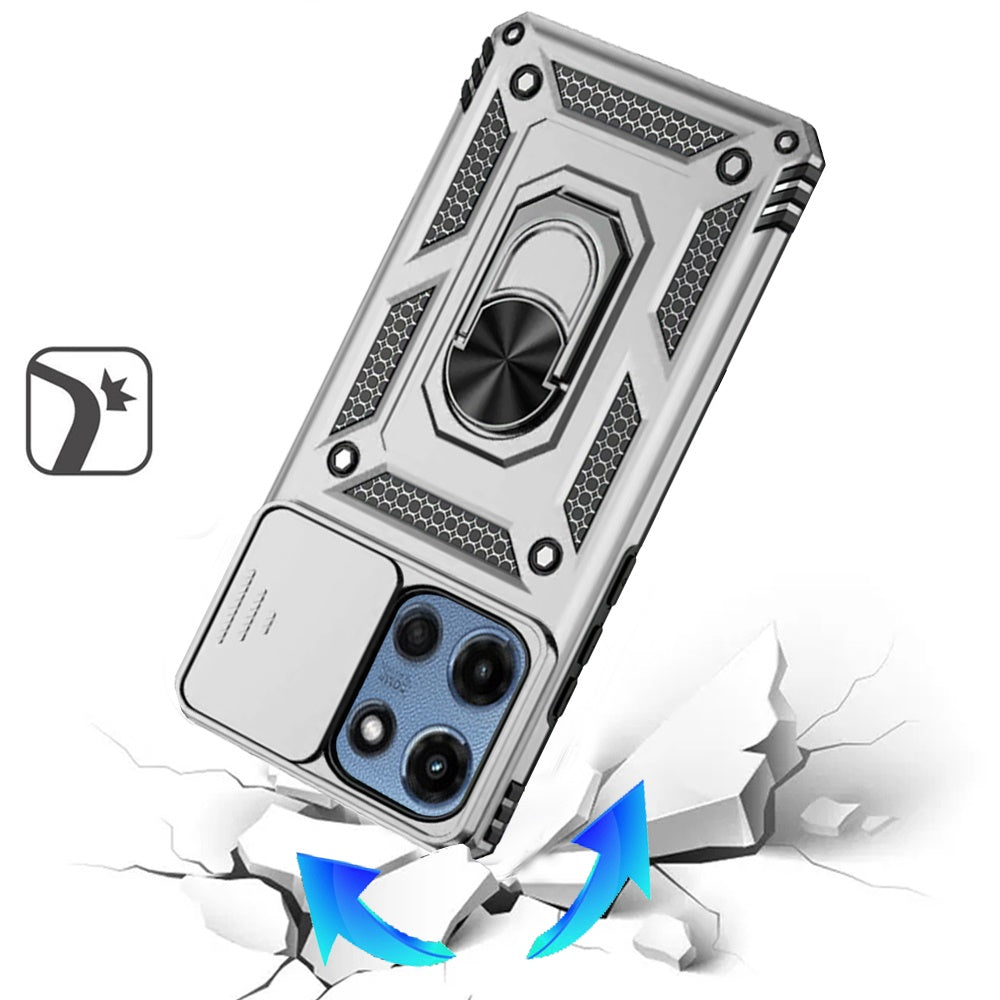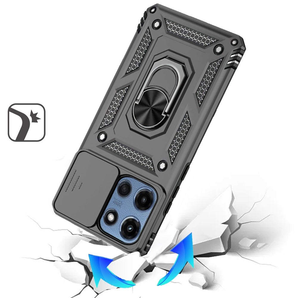 • Compatible for MOTOROLA Moto G 5G 2025, Smart Window: Delicate camera slide cover; higher than the raised lens; stuck in a groove. Premium lens protection, Magnetic Kickstand: Metal ring stand feature will bring you more convenience for movie-watching with multi-viewing angles. Built-in metal magnetic sheet which can be directly adsorbed stably to the magnetic car mount holder, Military Grade Shockproof: Military grade drop test standards; premium dual-layers defender case; enhance shock-absorption protection; Metal painted surface, Car Mount: Built-in iron plate allows the case easy to be attached to the magnetic car holder. Extremely convenient and excellent for phone calling while driving.(Not includes the magnetic car mount holder)