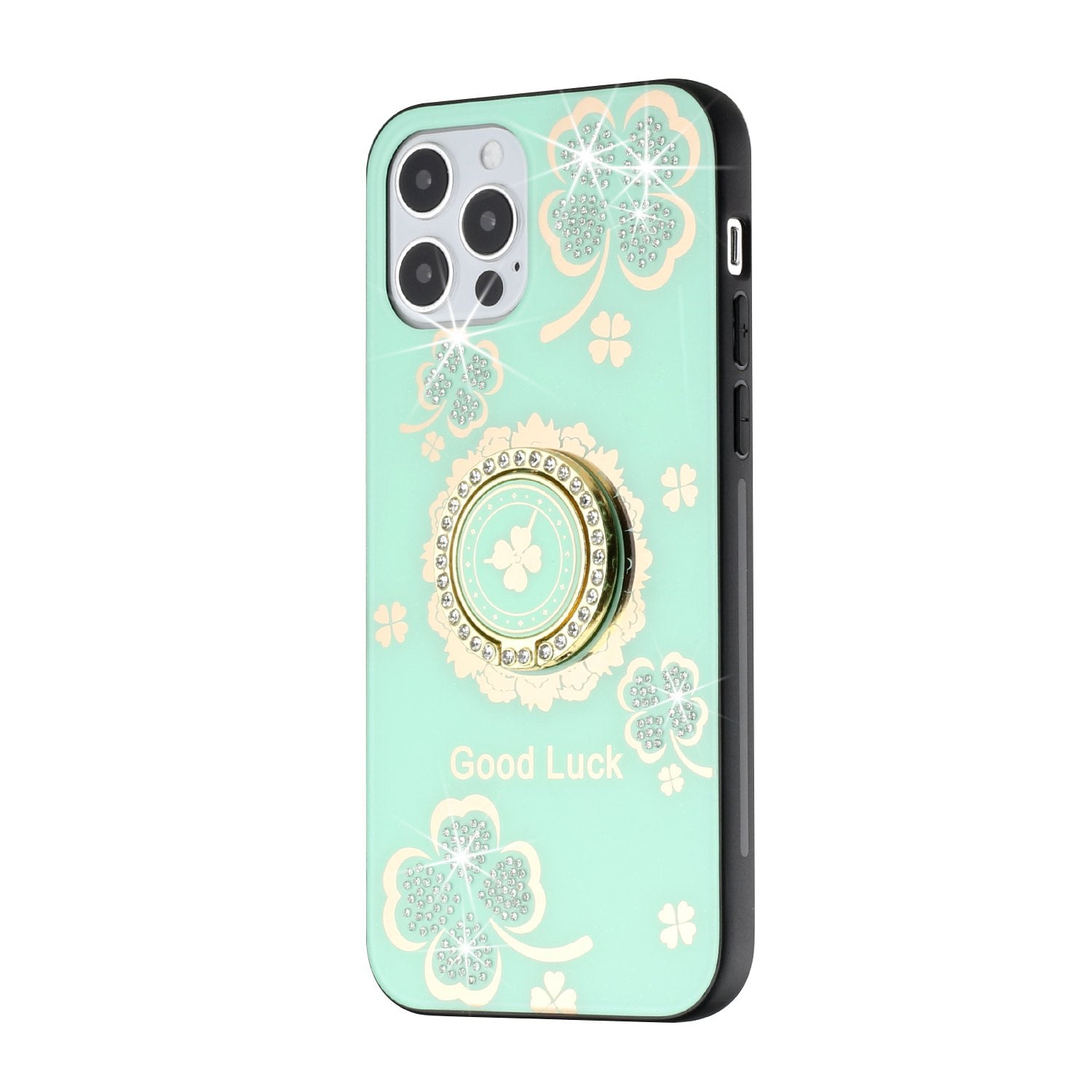 Teal Good Luck Floral Slim Luxury Bling Rhinestone Glitter Crystal Diamonds Love Floral Design TPU Case With Ring Stand Hybrid Shockproof Phone Case