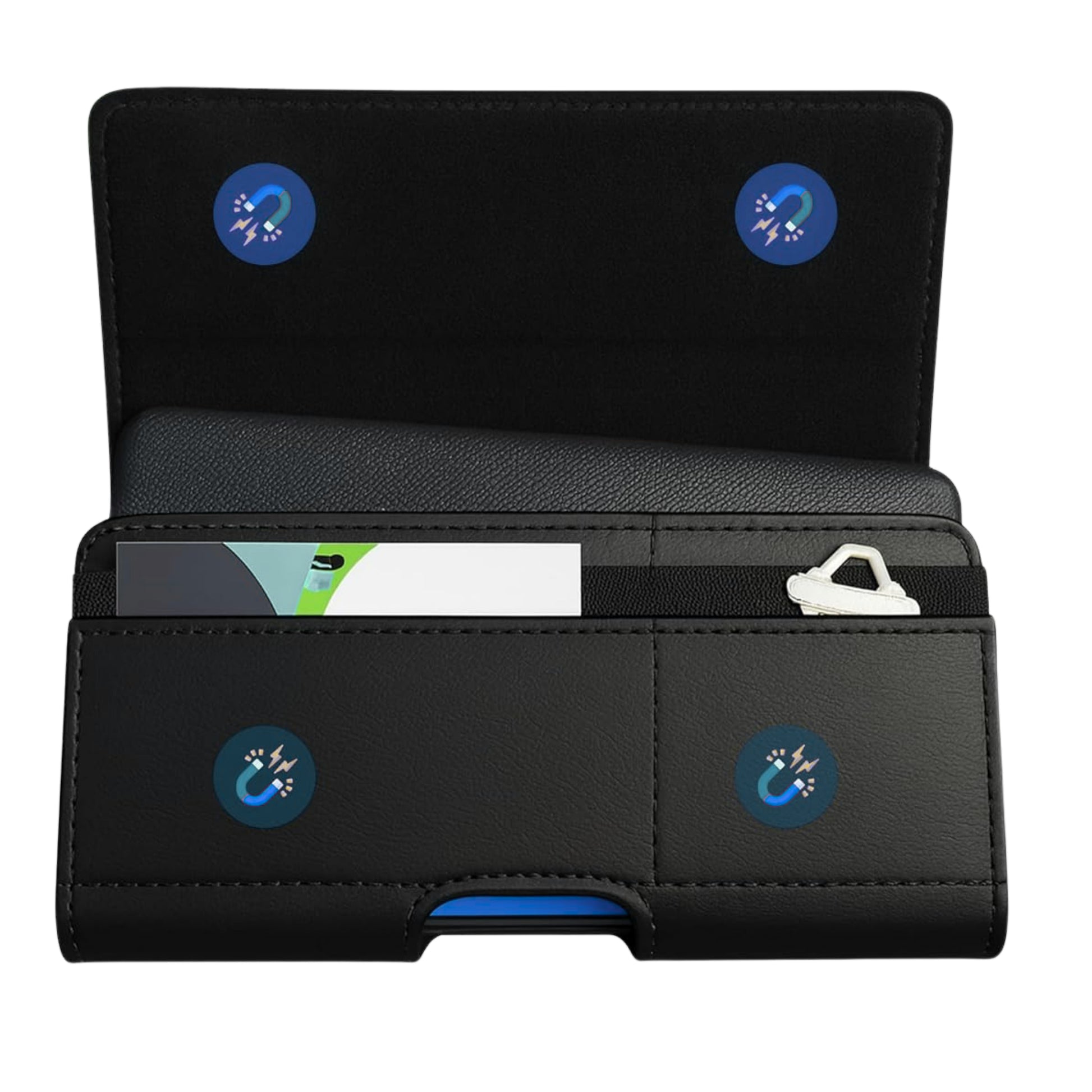 Black Pouch Case Cover For Galaxy A56 5G This magnetic leather phone pouch is designed to securely fit your phone. Crafted with a durable leather exterior and a soft inner lining, it helps protect your device from scratches, dust, and daily wear. The strong magnetic closure keeps your phone firmly in place, while the belt clip allows easy hands-free carrying for work, travel, or outdoor activities. With an added card slot for IDs or essentials, this pouch delivers both convenience and classic style.
