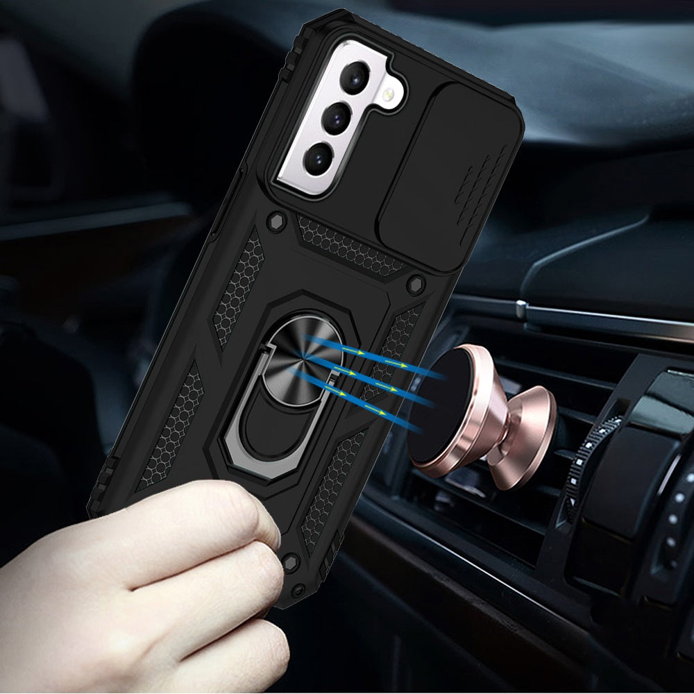 Well Protective Phone Case with Camera Cover & Stand, Slide Lens Protection and Built in 360° Rotatable Ring Holder, Soft Edge Bumper Protective Cover