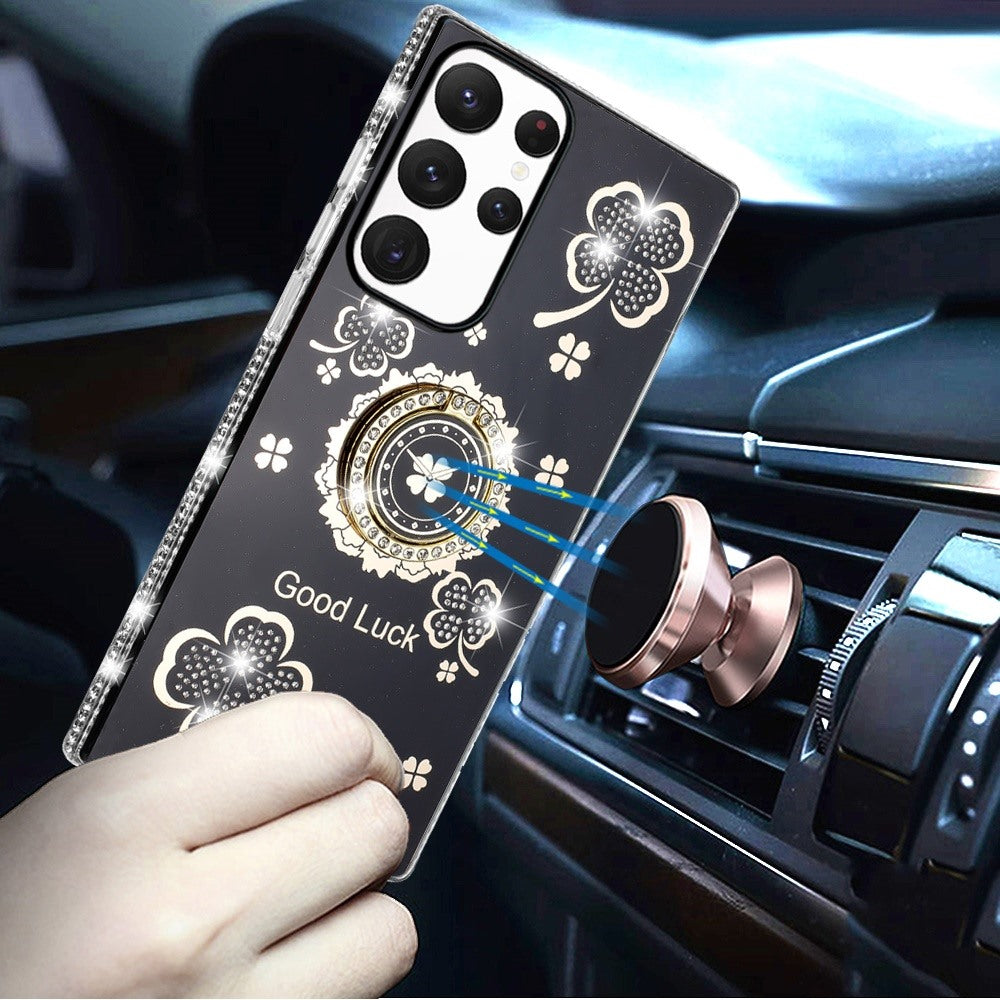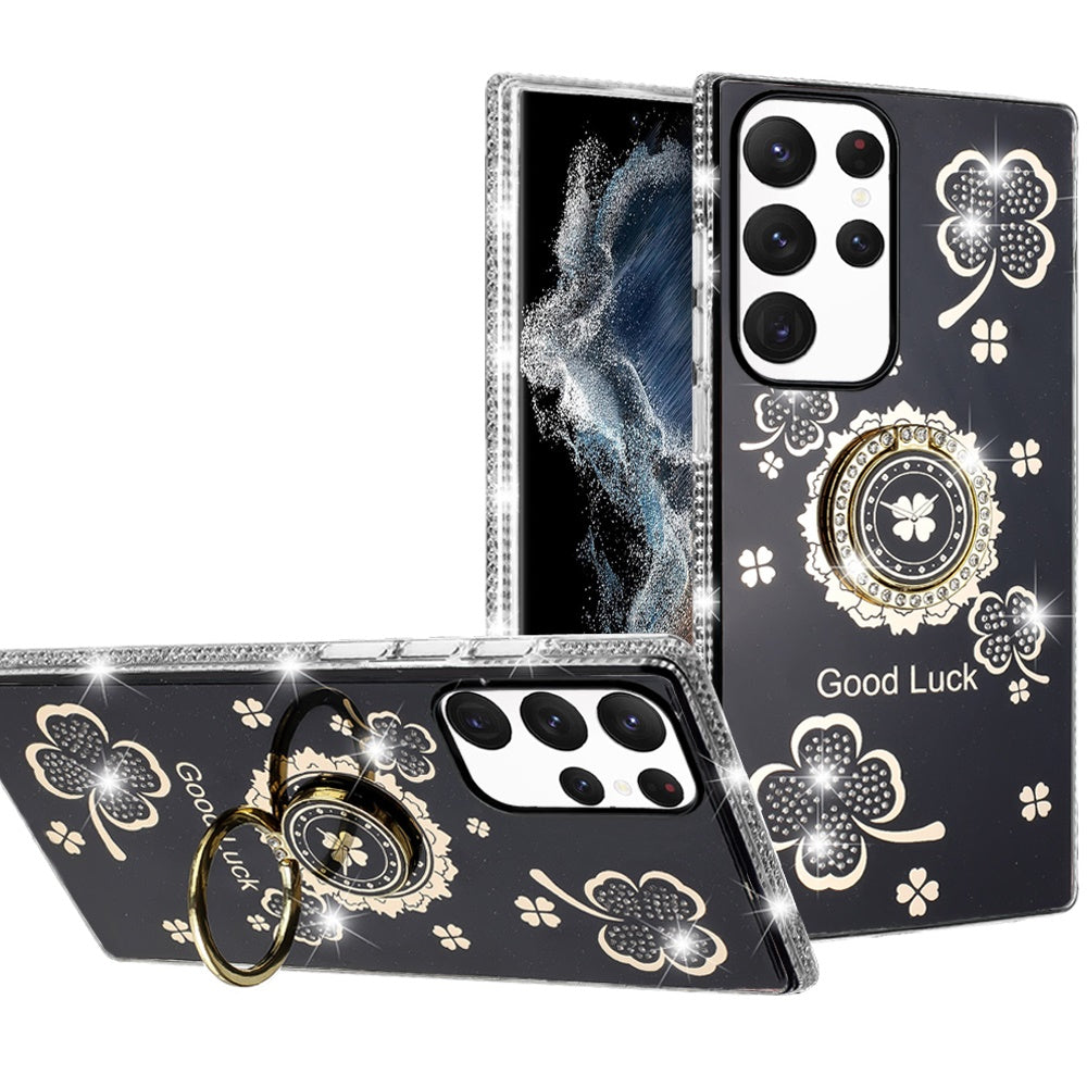 For Samsung Galaxy S22 Ultra Diamonds Bling All Around Edges Sparkly Glitter Hybrid Ring Stand Holder Fashion Good Luck Case Cover