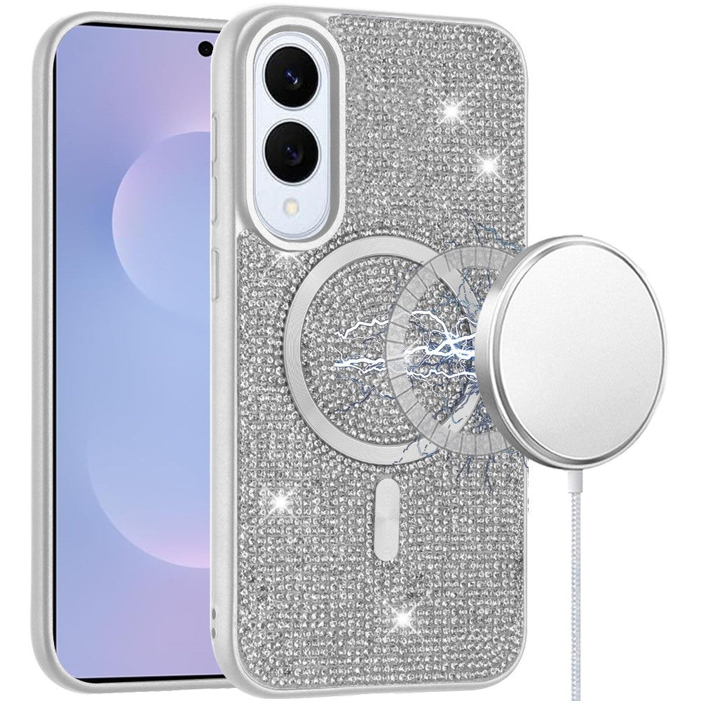 For Samsung Galaxy S25 EDGE Sparkly Diamond Bling Case Rhinestone Skin Hybrid with Magnetic Circle, MagSafe Compatible Case Cover White