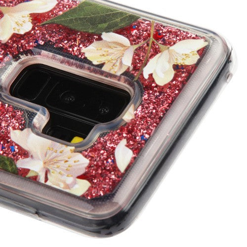 For Samsung Galaxy S9 Plus Quicksand Liquid Glitter Bling Hybrid Image Flowing Sparkle Protector Skin Sally Flower Phone Case Cover