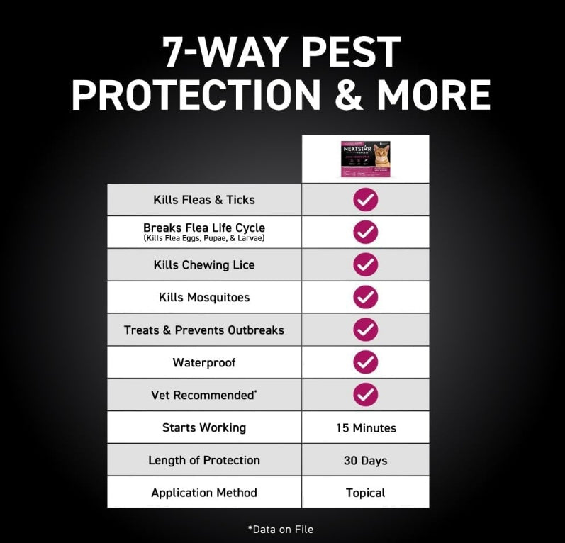 Start killing fleas and ticks on your cat in 15 minutes with NextStar Flea & Tick Topical for Cats. From The Makers of CapStar (nitenpyram), NextStar Flea & Tick Topical for Cats formula provides 7-way control by killing fleas, ticks, mosquitoes, chewing lice, and breaks the flea lifecycle by killing flea eggs, flea larvae and preventing flea pupae from developing into adult fleas. Formula previously only sold by vets, this effective cat flea and tick preventive topical is available online and at local retailers without a prescription. Use NextStar Flea & Tick Topical for Cats to stop active flea and tick infestations and prevent new ones from occurring for up to 30 days. Reapply monthly for year-round protection.