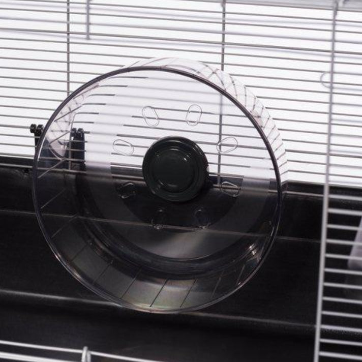Prevue Pet Products Quiet wheel is constructed entirely of plastic with ball bearings that keep the wheel whisper-quiet when in use. No more squeaks or rattles! Great for providing exercise inside or outside of the cage. Use with a stand or remove from the stand and fasten to cage wires. Base disassembles from wheel making cleaning a breeze.