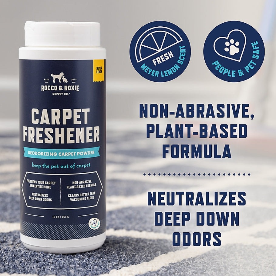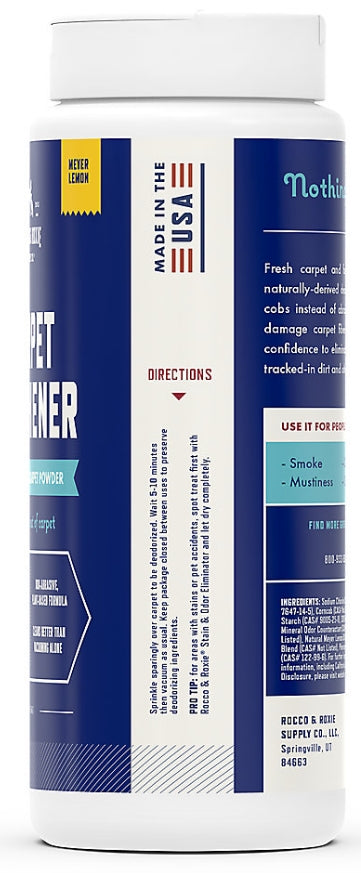 Fresh carpet and furry friends go hand-in-paw with Rocco & Roxie Carpet Freshener. Just sprinkle, wait and vacuum - the naturally derived formula neutralizes deep-down odors to freshen your carpet and your entire home. Its made of easy-to-vacuum corn cobs instead of abrasive baking sodas that can linger and damage carpet fibers. Normal vacuuming removes only 65-75% of baking-soda products from carpets, while it removes 97-98% of Rocco & Roxie Carpet Freshener deodorizing powder. And it leaves the fresh, citrusy scent of Meyer lemons.
